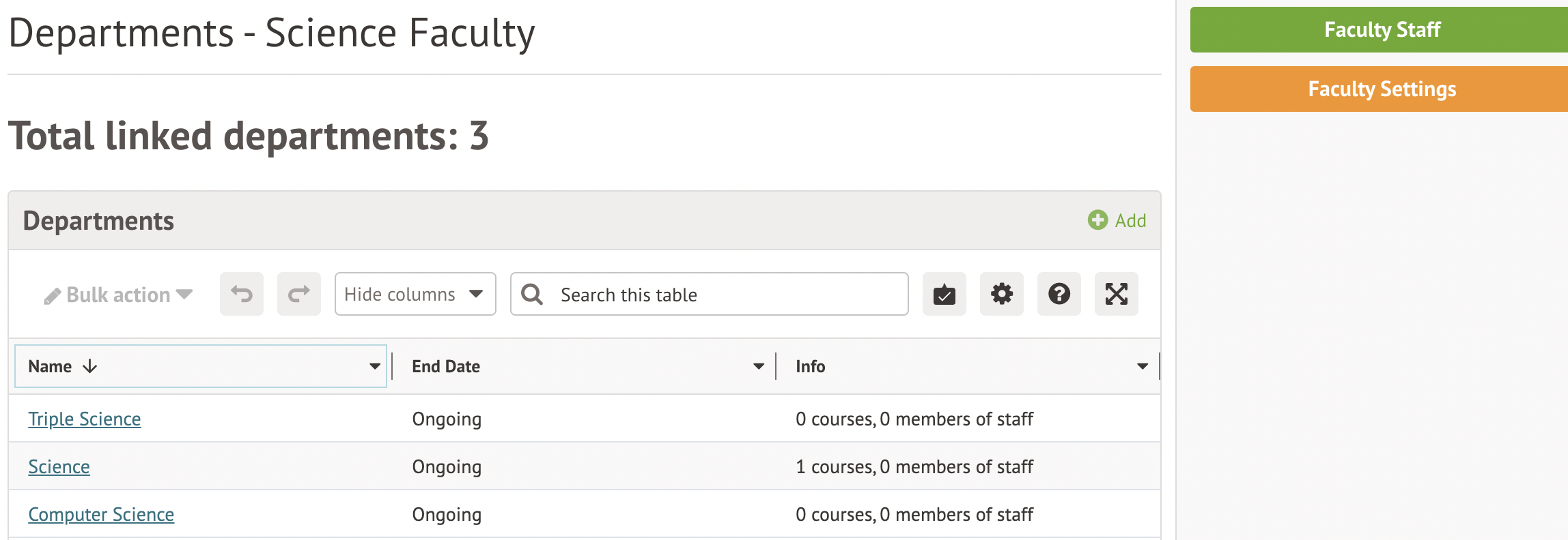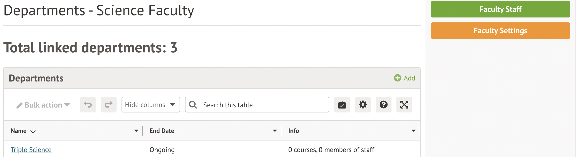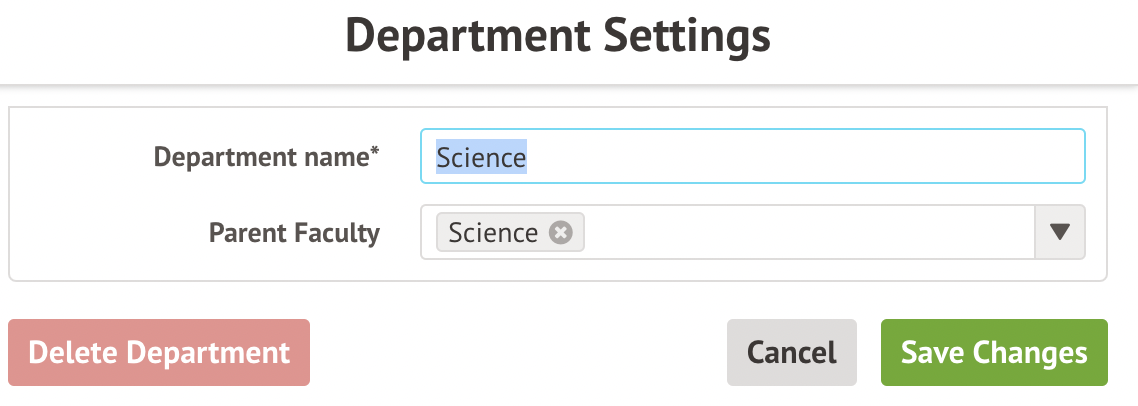 If you wish to use Faculties, it's easiest to first set up your faculties, and then add your departments into them. If you do not want to use Faculties, take a look at our other article on Departments to find out how to add Departments without using Faculties, add stand-alone Departments, and add courses and staff to Departments.