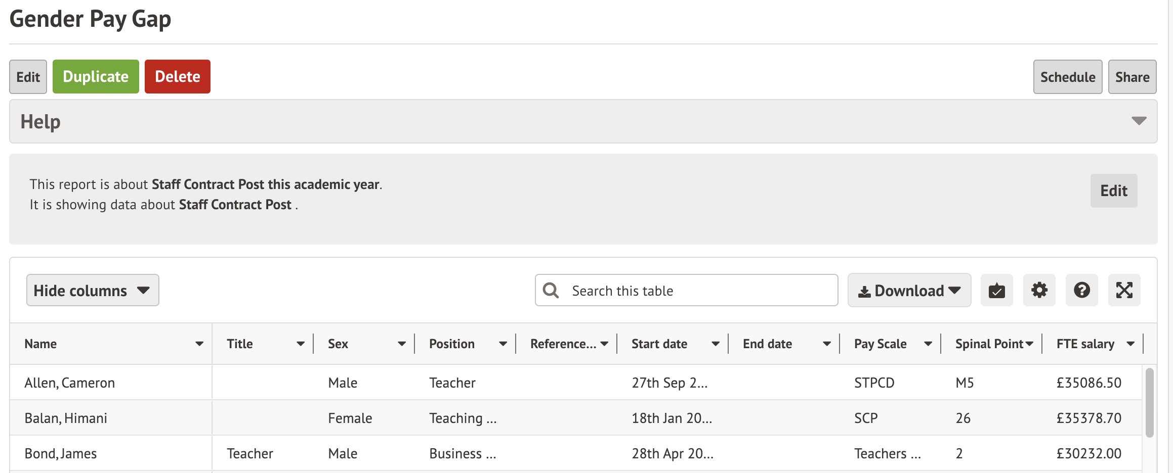 Although it isn't possible to calculate all the statistics in Arbor, you can use our Gender Pay Gap Report Template to create a report of a lot of the information you'll need. This template shows staff, title, Sex (rather than Gender Identity - more details here), position, reference number, start and end dates, spinal point, FTE salary, Base pay pro-rata and working hours per week. You can then click Download to export your report to Excel to complete your analysis.
