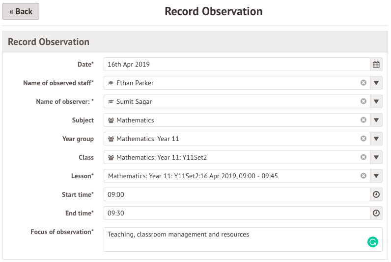 Arbor's Observations feature lets you record observation outcomes for a variety of different types of observations you have set up. When recording an observation, select an observation form and compete it for an individual member of staff.