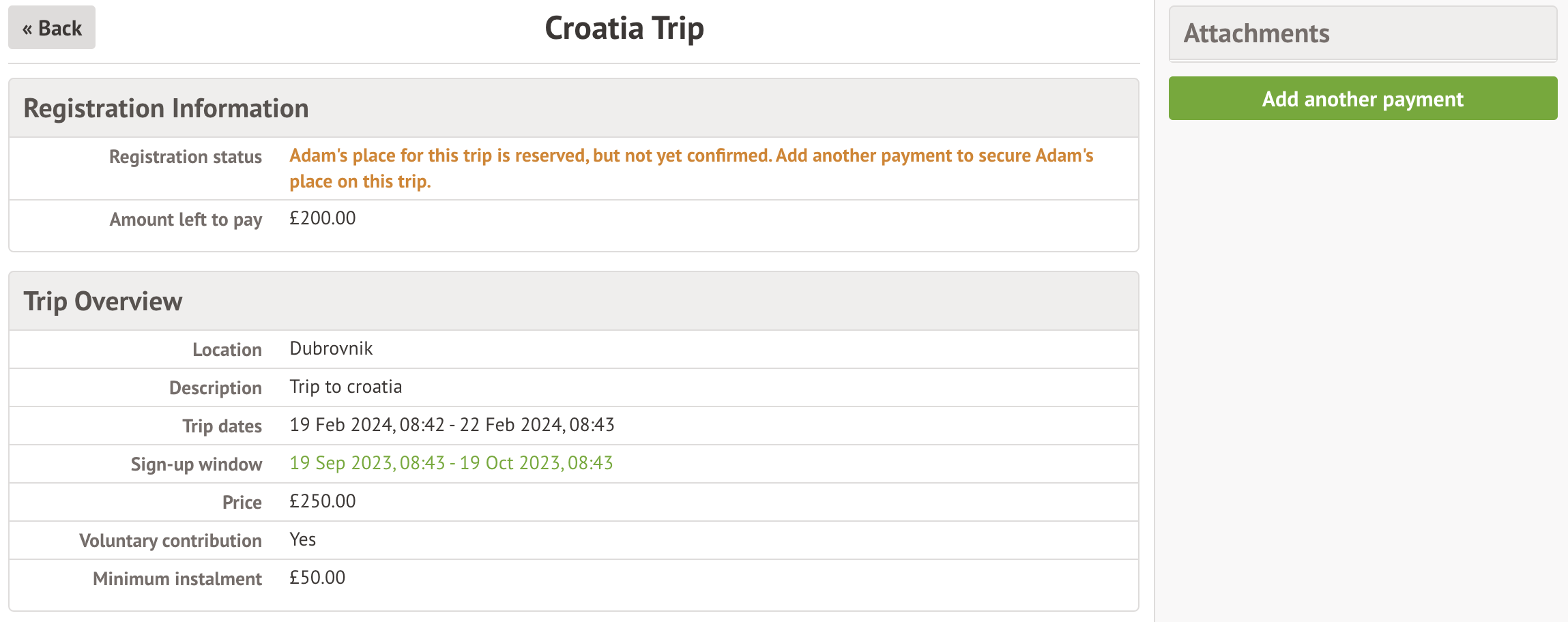 • Clubs and Trips - Set up free or paid Clubs and Trips for guardians to sign up for on the Parent Portal or Parent App. Depending on your settings, guardians can pay a variable contribution or not, pay the cost of a trip in instalments or select the membership periods to sign up for clubs.