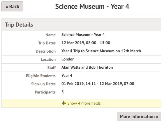 To take attendance for the trip, go to School > Activities > Trips. Select the trip you want to take attendance for.