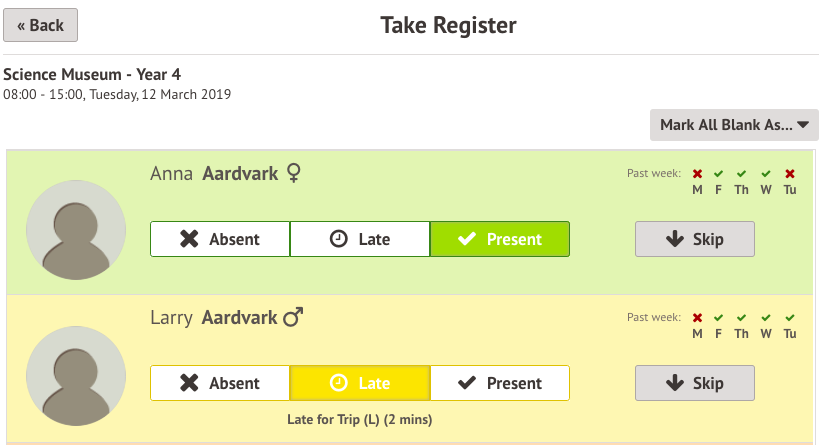 Once you’re in an active trip session, you’ll be able to take the register just as you would from a lesson dashboard.