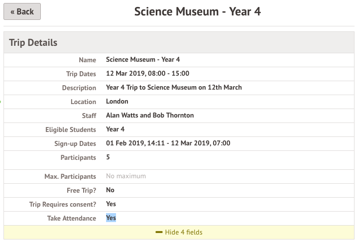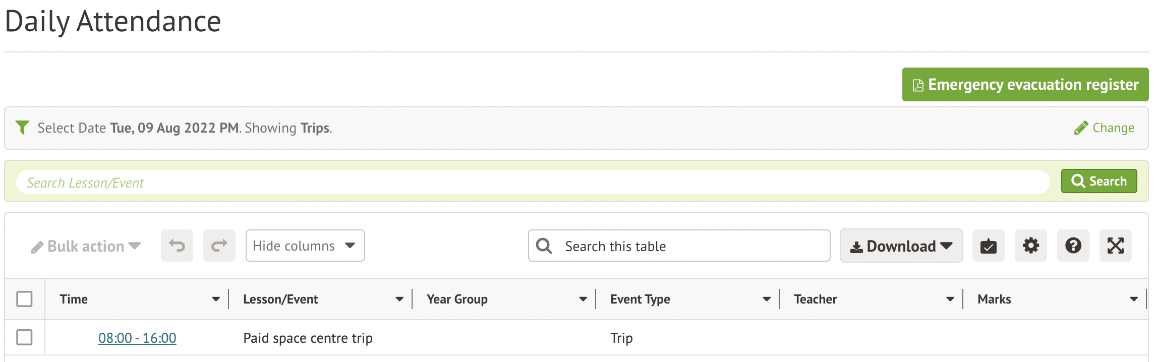 Please note that trip attendance does not fill in the students' usual lesson register or attendance certificates, so you'll need to make sure these are also updated. You can see how to do this here: Does trip attendance contribute to statutory attendance or fill in lesson registers?