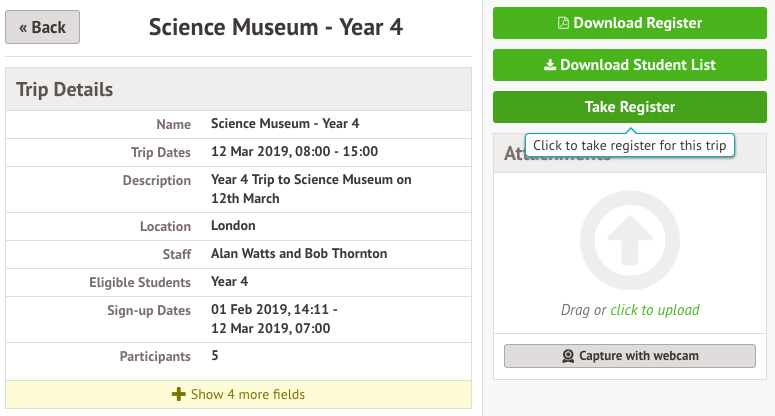 To take attendance for a trip you'll need to have enabled attendance to be taken during the setup.