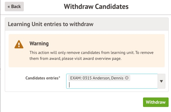 If you are you are withdrawing a student from a Unit page, on the other hand, the student will only be removed from the corresponding Unit and not the Award. You will be presented with a slide-over confirming this with the message "Warning - This action will only remove candidates from learning unit. To remove them from award, please visit award overview page" after using the Bulk action button to Withdraw Candidates.