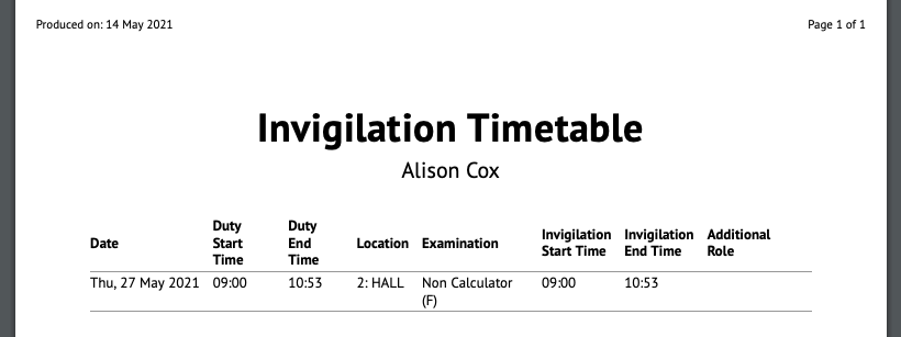 You can add and manage your invigilators in Arbor, including printing timetables for them.