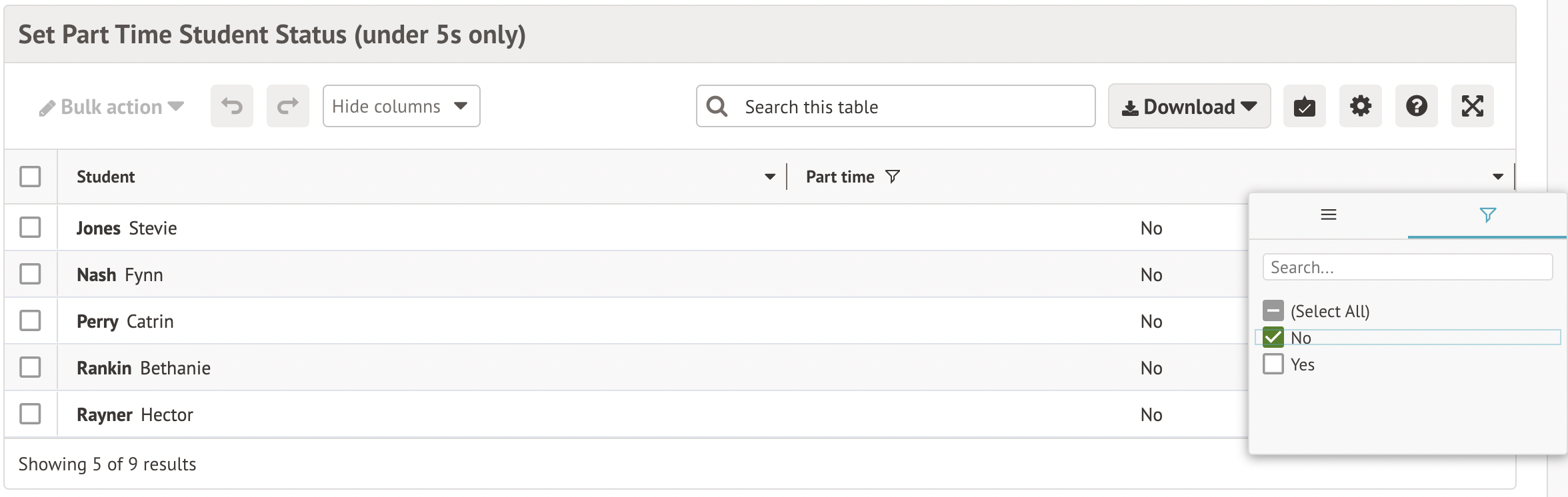 Calculate the number of students who are marked as No. You can do this by typing no in the Search box and seeing the total at the bottom of the table, or filtering the table.