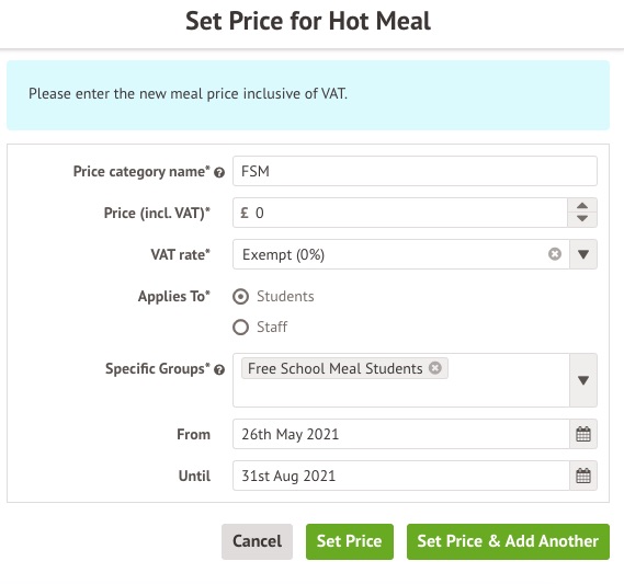 - Set the Specific Group the price applies to. For example, Free School Meal Students for FSM; Reception, Year 1 and Year 2 for UFSM; or All other students for the remaining students.