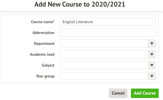 Click +Add on the School > Programmes > Courses page. You can only select one year group per course you create. Leave the Year group field blank to be able to create sub-modules assigned to different year groups. When all the details are correct, click on the green Add Course button.