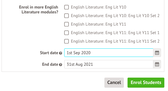 Don't tick any of the boxes to enrol them in other bottom-level courses, add the dates and enrol the students.