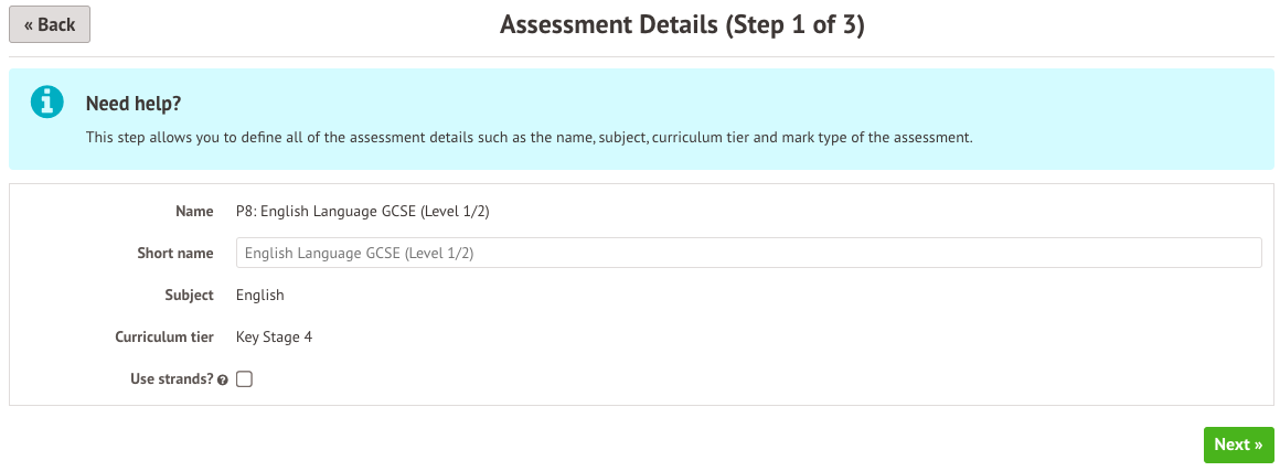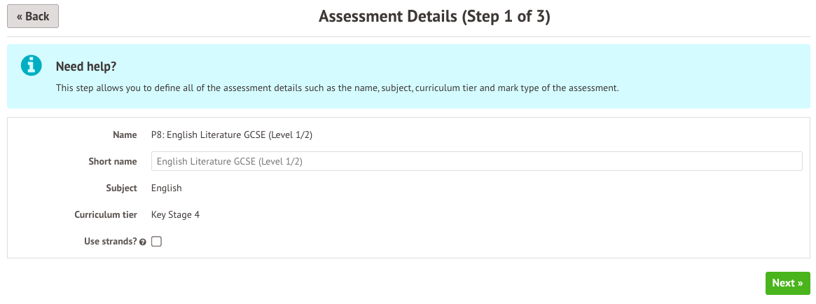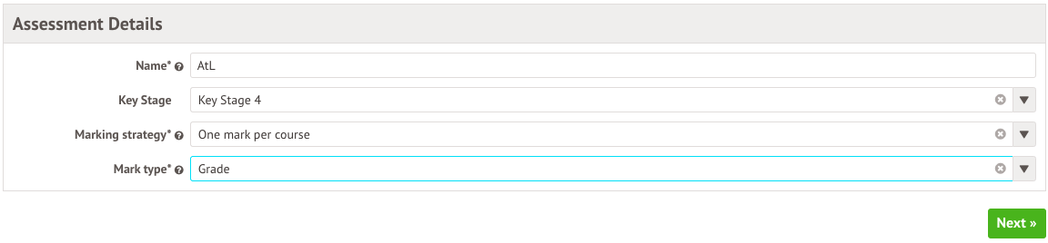 - Subjects - If you only want to assess the English courses, select English as the subject. If you want to assess all courses, leave this field blank and the assessment will be linked to all the courses.