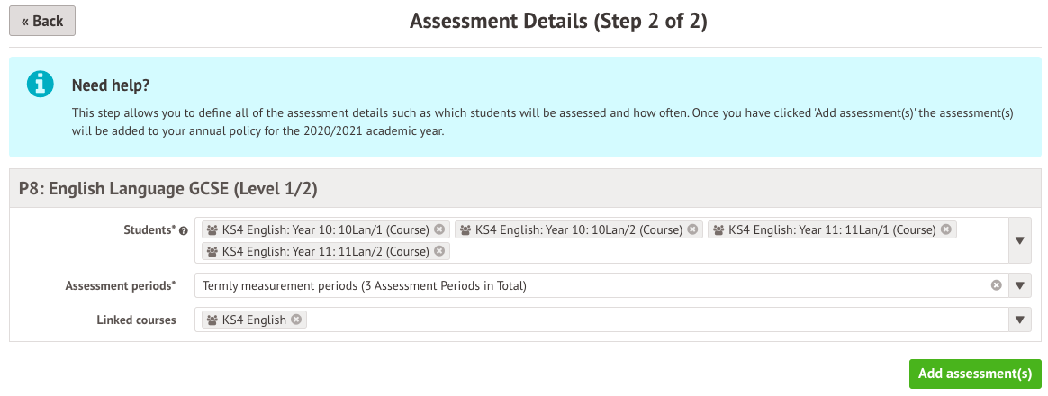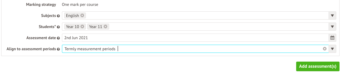 - Assessment date and assessment periods - Select the same assessment periods as your English assessments.