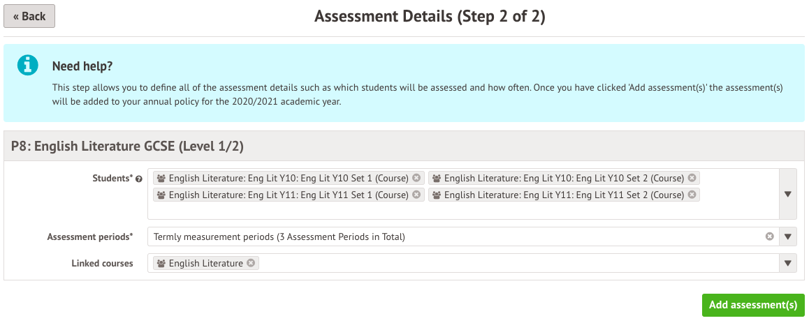 Select the students in your literature courses to link to, and select the English Literature course, then click Add assessment(s).