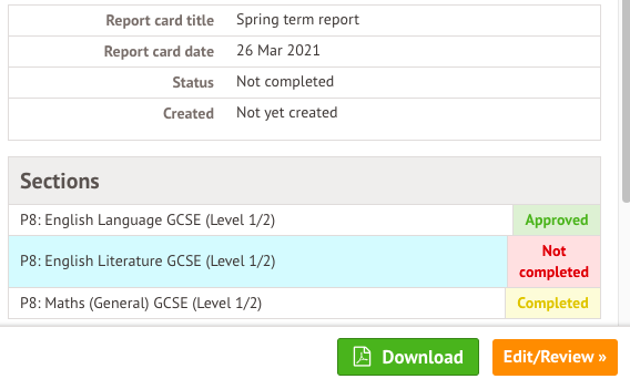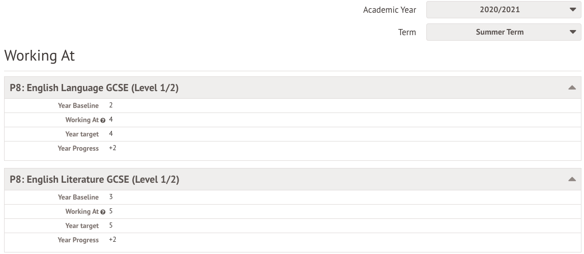 From the Report Cards tab you can click a student's name to view the different attainment sections of the report card.