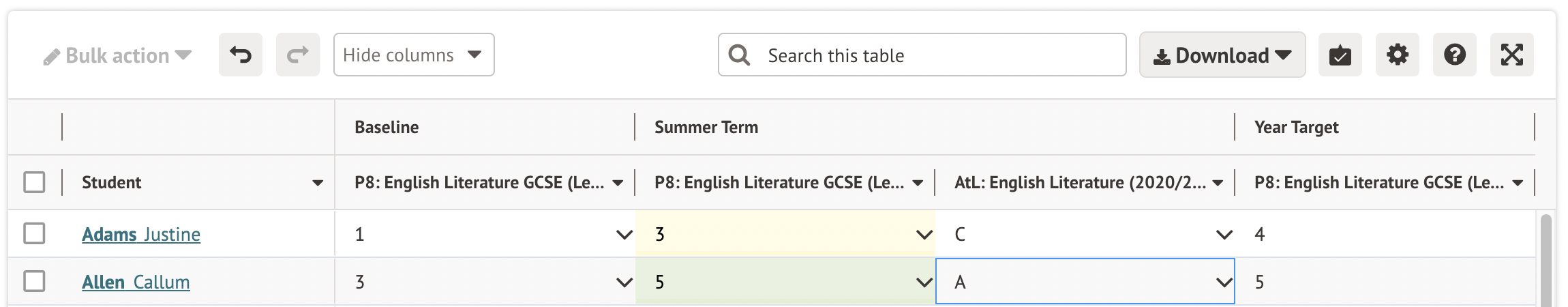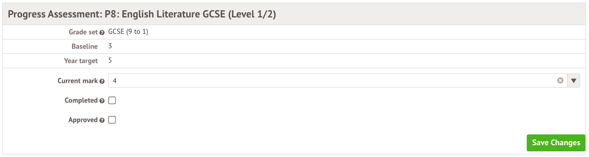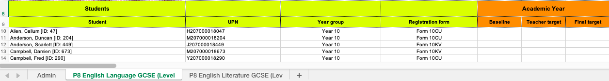 You can fill in the baseline, year target and final target for each student (what they are expected to get at the end of GCSE). Then follow the instructions in the article above to import the baselines and targets back into Arbor.