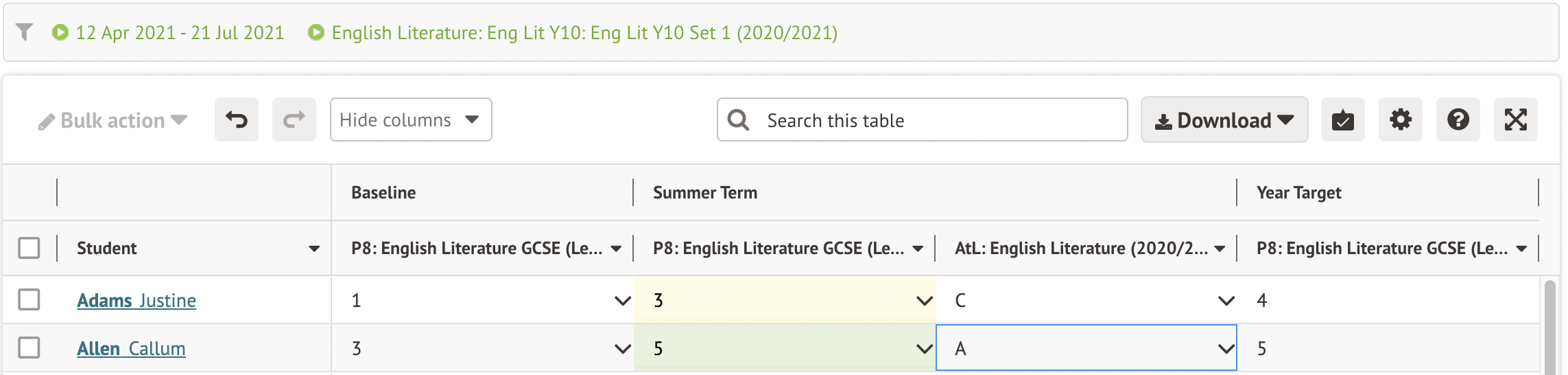 For English Literature and Language, students may be grouped into the same lessons together, but assessed for each subject separately. With our template setup detailed below, we'll show you how to set up two separate assessments - one for Literature and one for Language - without changing your scheduled lessons.