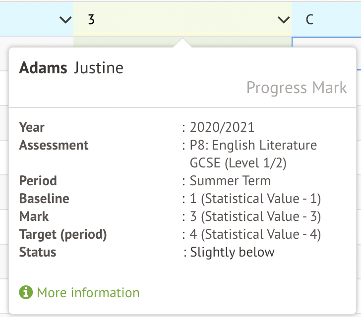 To be able to analyse your overall assessment, you will have needed to input a baseline (to calculate progress) and an Academic Year Teacher Target to get the marksheet to be colour-coded.