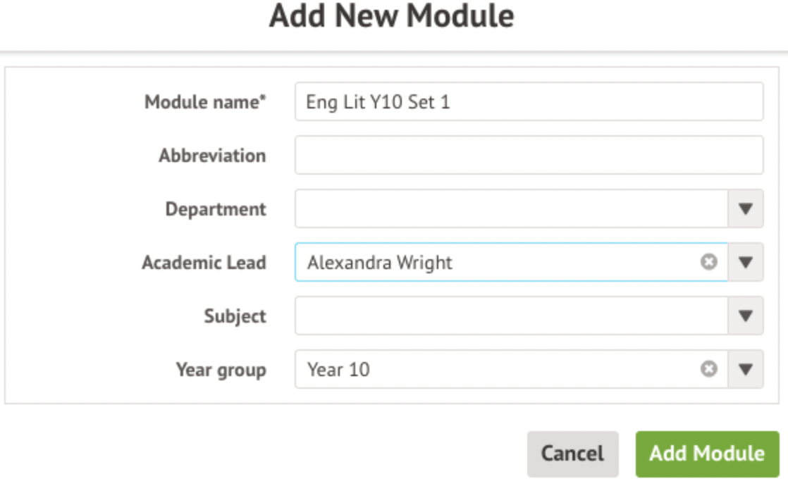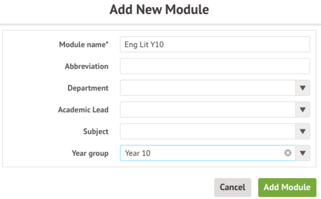 In the slide over add the name of the module and fill in the other details. Select the year group then click the green Add Module button.
