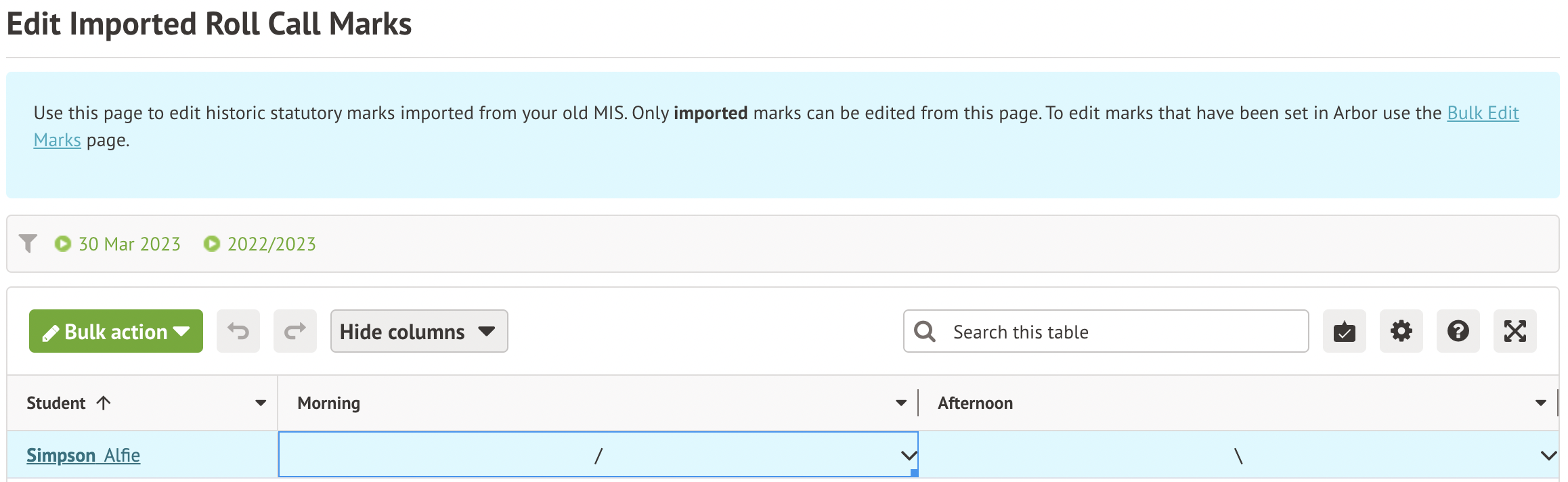 As these attendance marks were not taken in Arbor, you cannot amend them using Arbor's standard attendance pages. In Arbor, we have a feature that allows you to edit attendance marks that were taken in your previous system and then migrated over to Arbor.