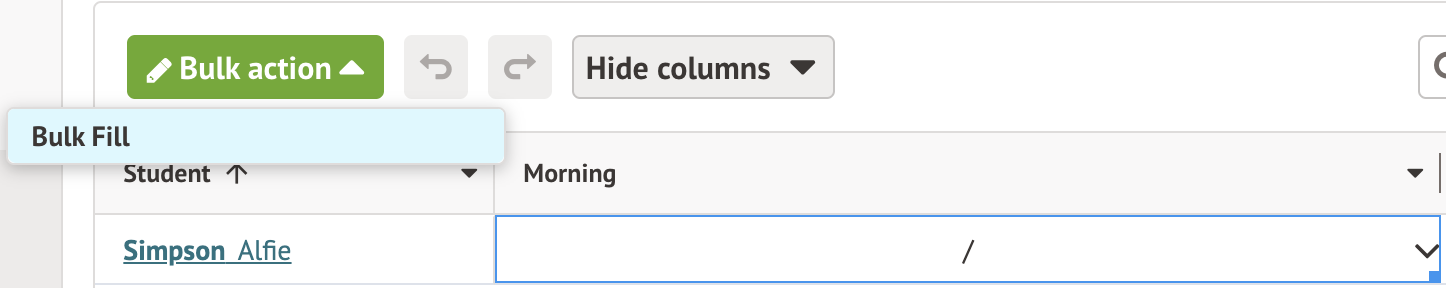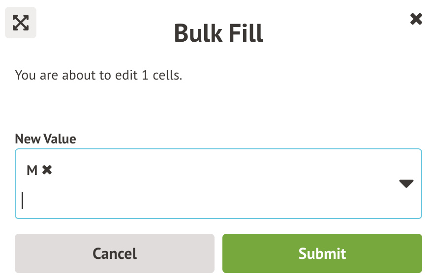 Once you have selected the (editable) cells to update, click the Bulk action button to change the cell values in bulk.