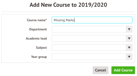Go to School > Programmes > Courses and click the green +Add button. Name the course Missing Marks and leave the rest of the options blank, then click the Add Course button.