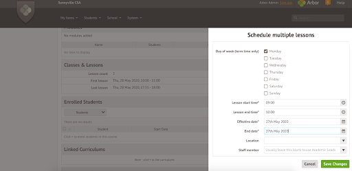 You'll then be taken to the class overview. Scroll down to the Classes & Lessons section and click +AddSelect to schedule a single lesson to fill in one specific lesson's mark, or select multiple lessons to add multiple missing marks. Choose the day and time of the missing marks, then click Save Changes.