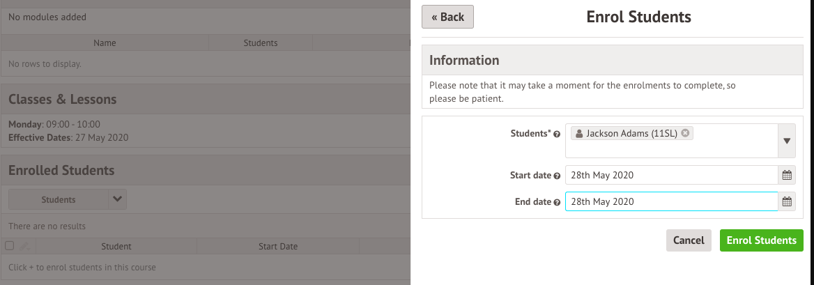 Next, scroll down to the Enrolled Students section and click +Add. Select Enrol students and add in all the students with missing marks.