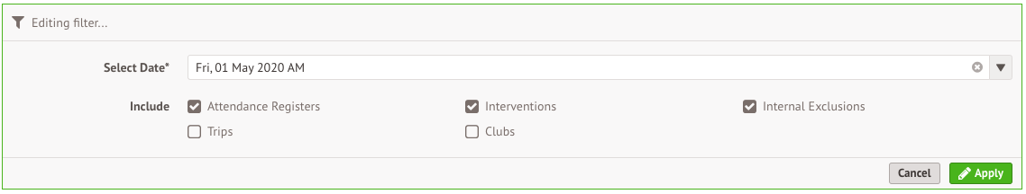 Click on the filters at the top of the page to select the date you require and the group of students.