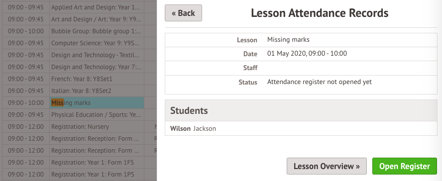 Find your Missing Marks and click it to open the slide over. In the slide over, click Open register.