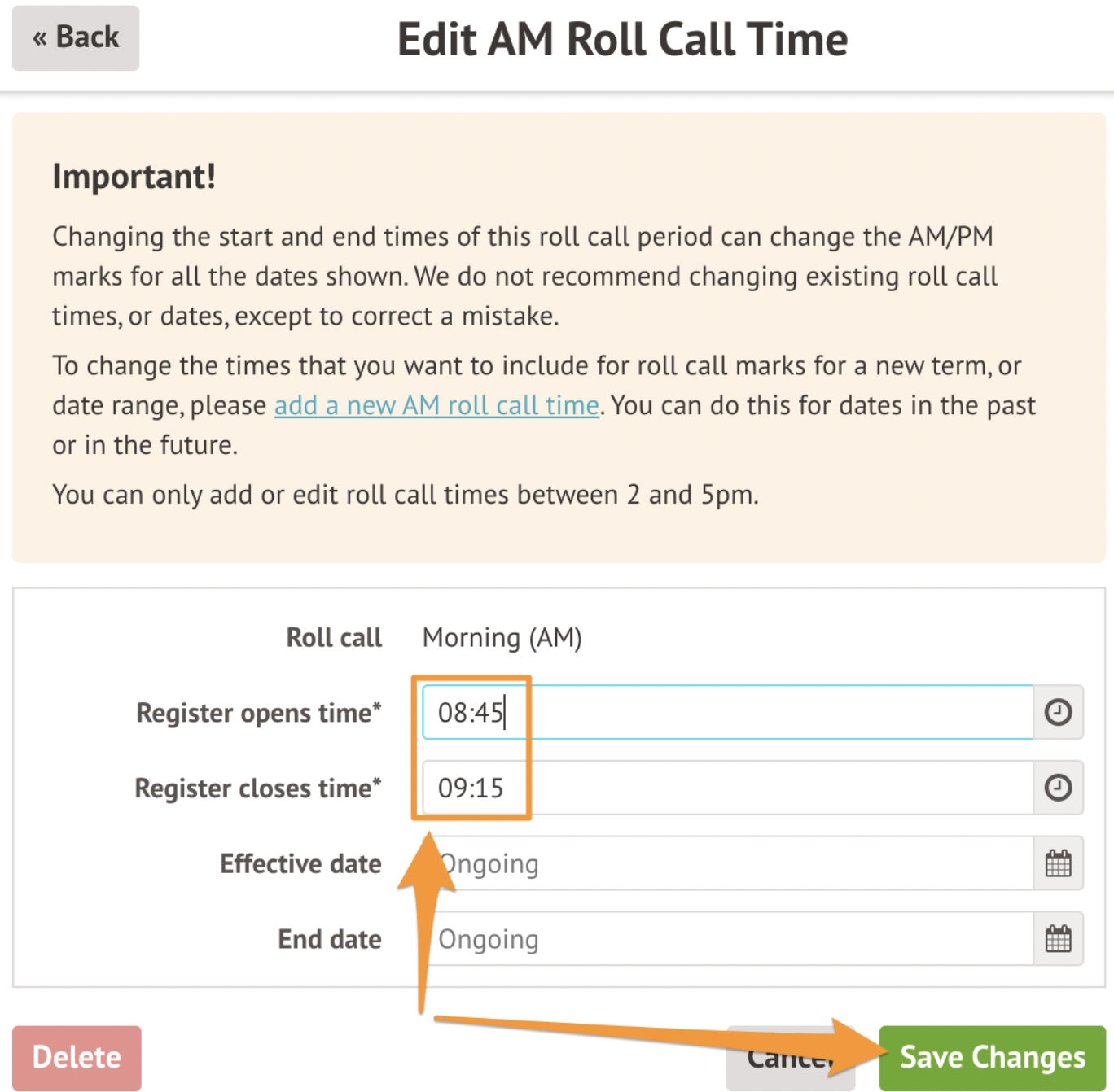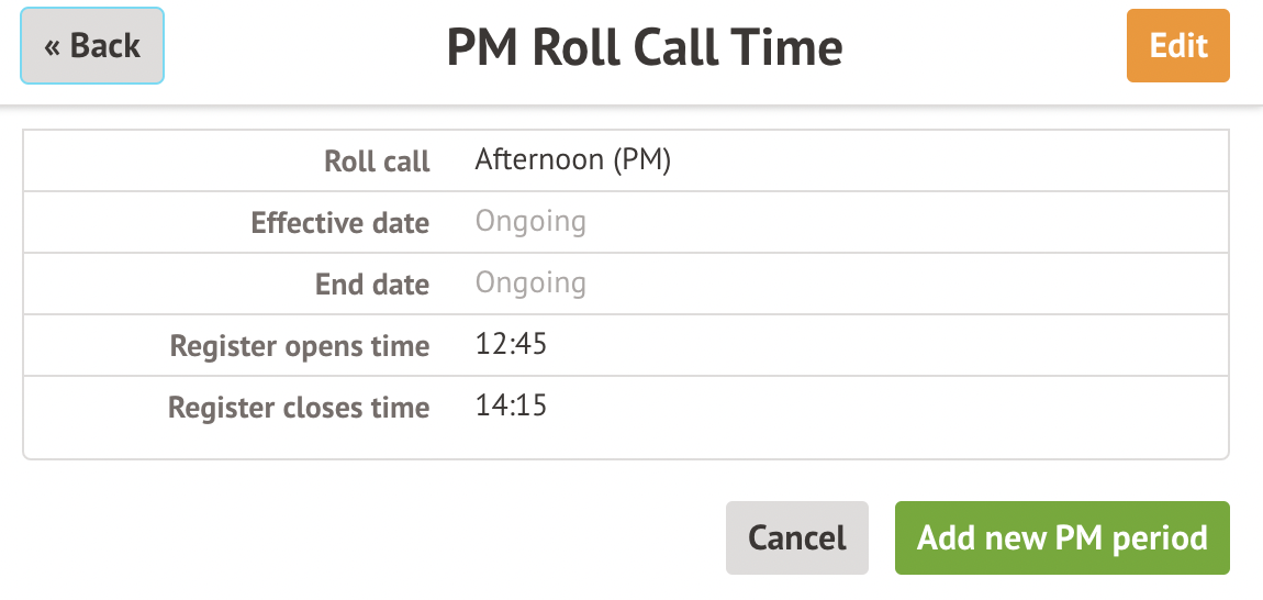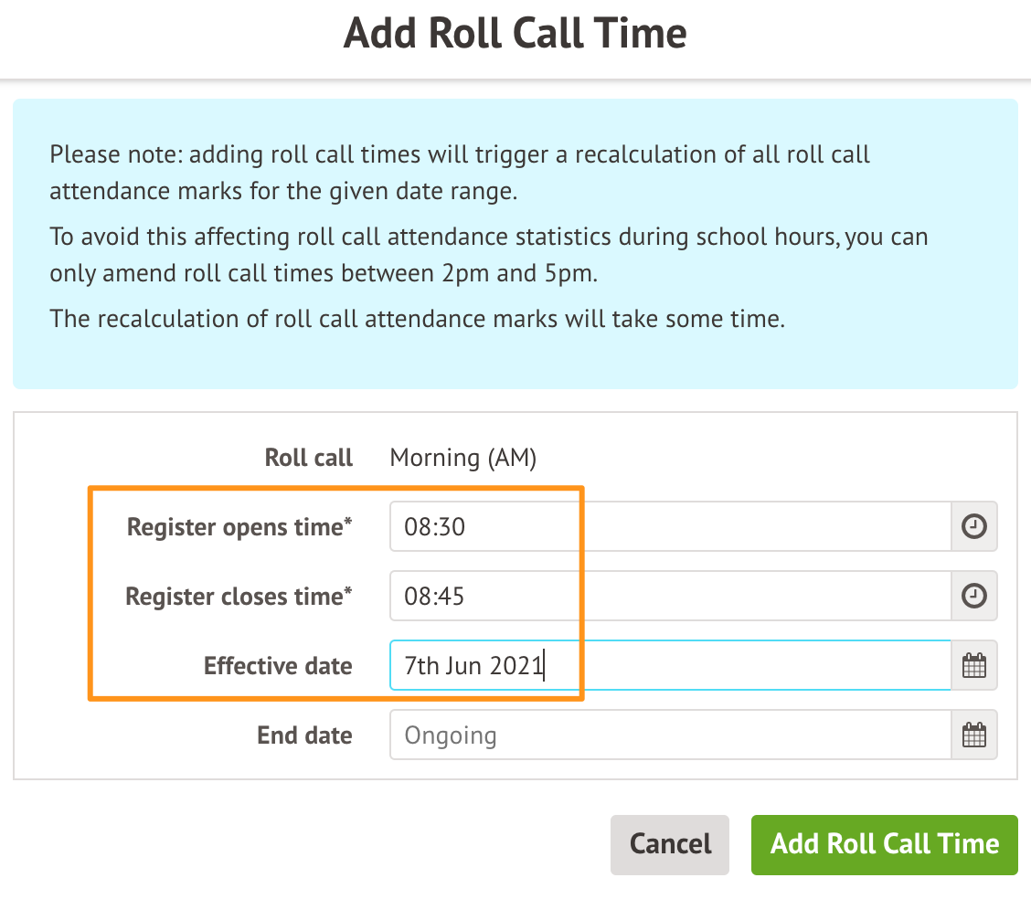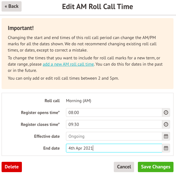 If you need to change your Roll Call times, we recommend adding a new roll call time rather than editing your existing one. This means the roll call times will only apply to registers from that date onwards and won't recalculate any past attendance.