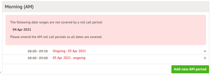 If there are any dates not covered by a roll call period, this will be flagged to you. You'll need to click into the roll call and click Edit to make sure all dates are covered.