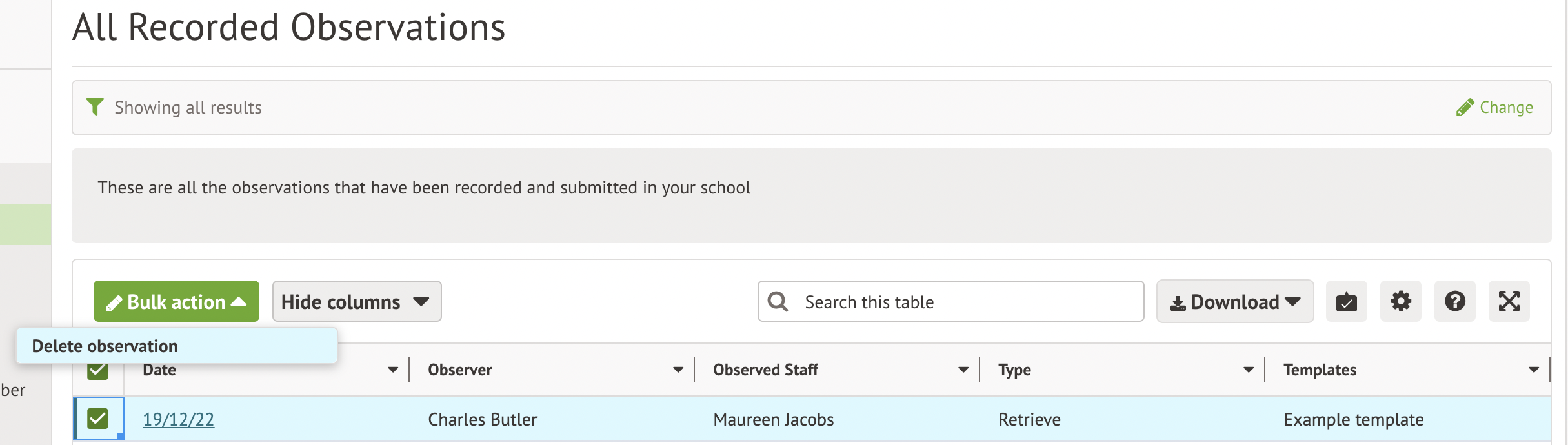 Go to School > All Staff > Staff Development > Observations > All Observations. Tick the box next to the observations you want to delete, then click the Bulk action button.