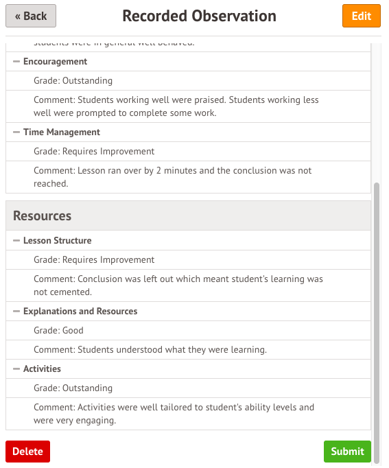 - Submit - Click this you want to save and submit the observation to your school. This will mean the results will be viewable by all staff members with permission to see it and will contribute to the analysis statistics.