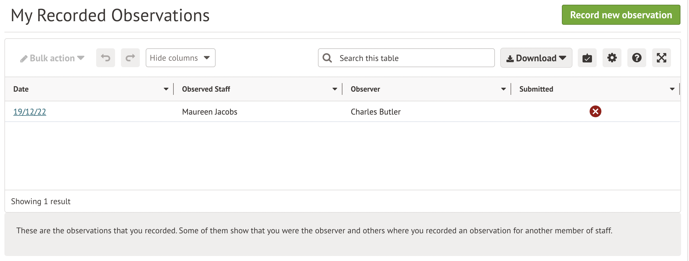 Once you have done this, go to School > All Staff > Staff Development > Observations > My Recorded Observations to record an observation. Click the green button to record an observation.