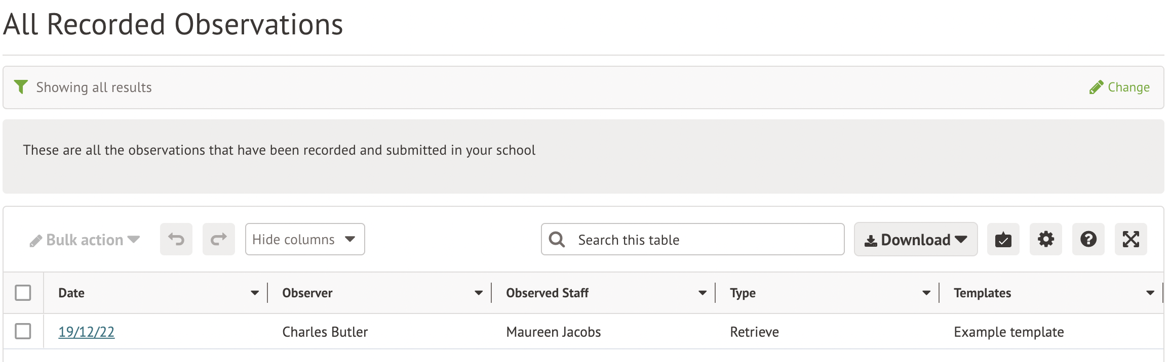 To be able to record observations, you must have first set up an Observation Type, including the Grade Set, and a corresponding Observation Template.