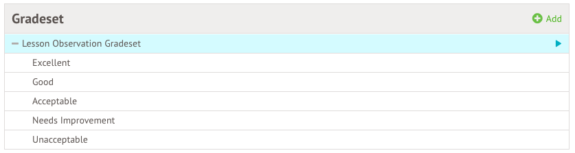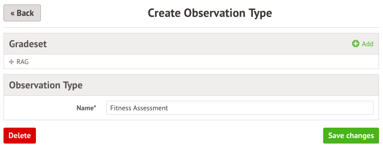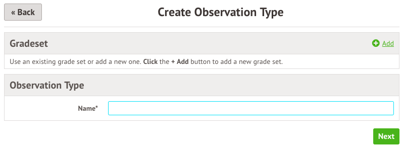 On the next page, you can see a section to add a Grade Set and the name of your Observation Type. Click +Add to add a Grade Set.