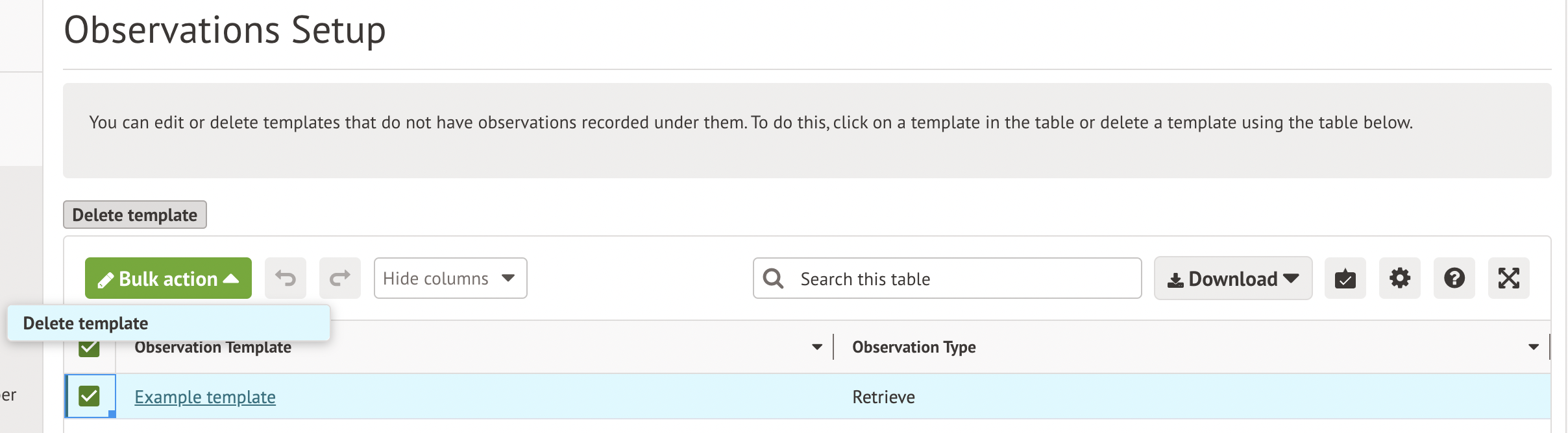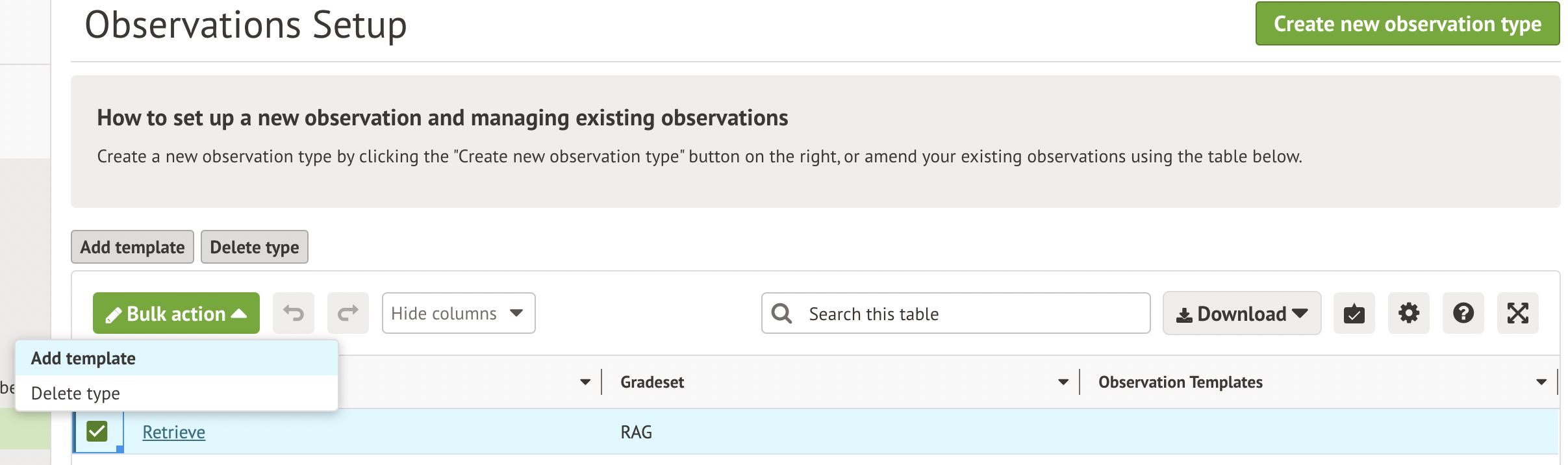You can add a template to one or multiple Observation Types by ticking the boxes next to the observation names, then clicking the Bulk action button and selecting Add template.