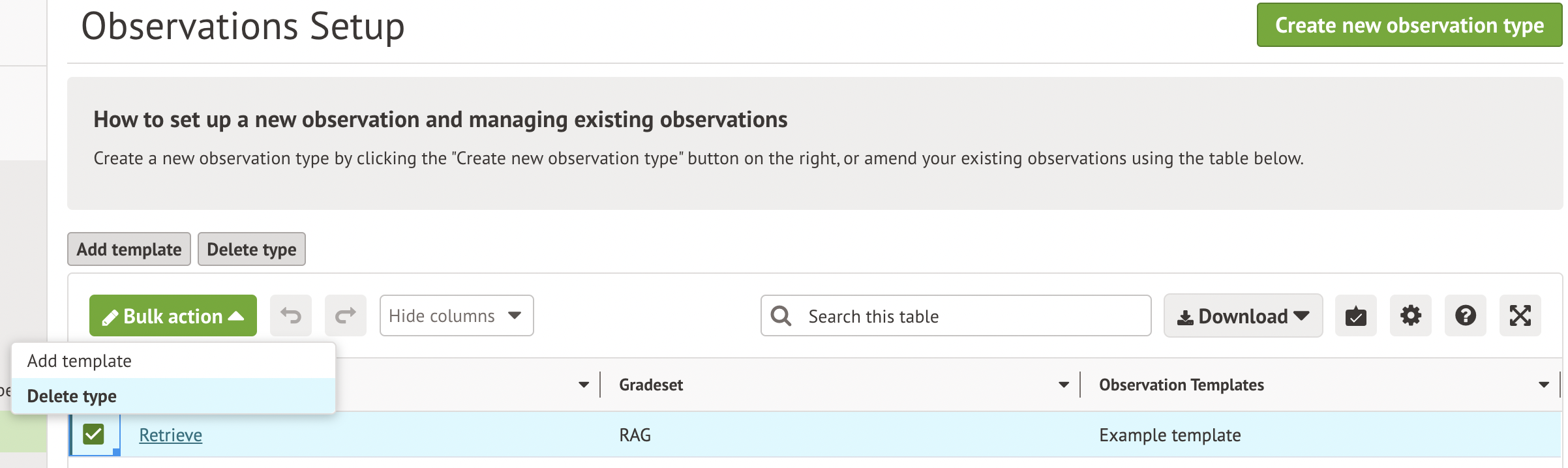 In Observation Types, you can delete a Type by ticking the box next to it and clicking the Bulk action button. You can also click the Delete Type button.