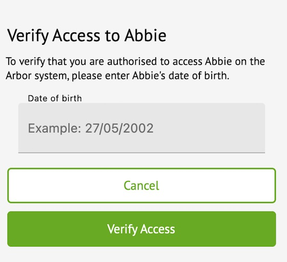 As an added layer of security, when guardians sign in and try to access the details of one of their linked students for the first time, they are required to enter the child's date of birth (DOB). Once the DOB has been accepted, the guardian will not be asked to enter for that child again.