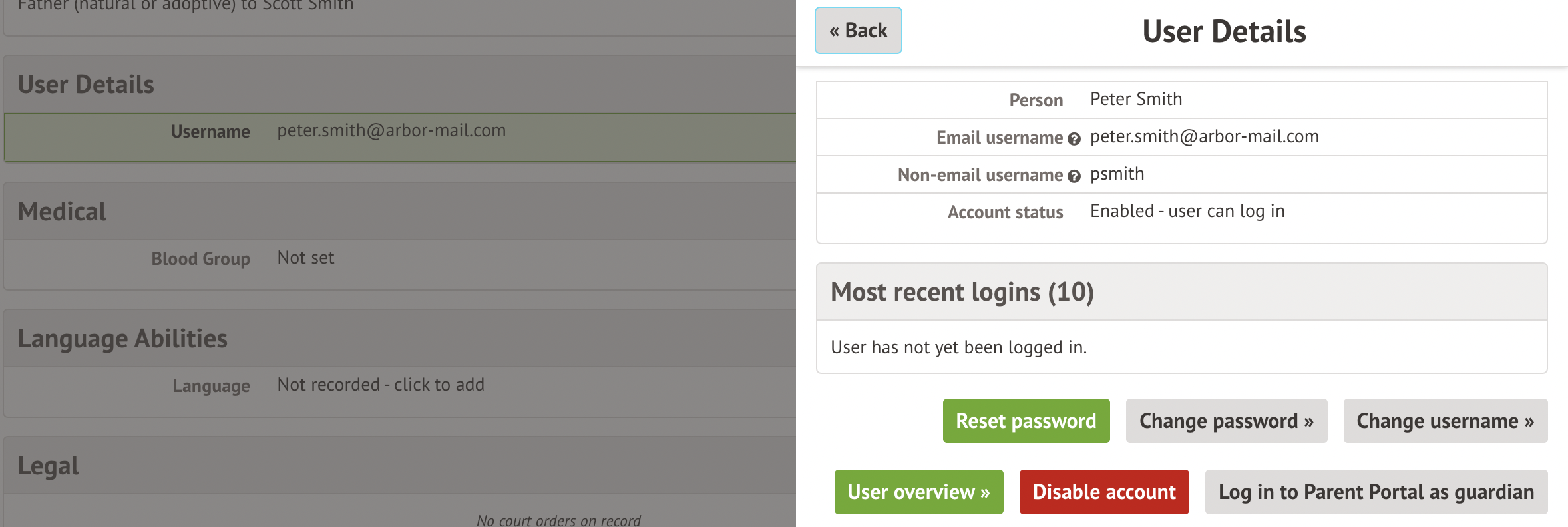 Go to the guardian’s profile, scroll down to User Details, and click on the Username. In the slide-over, check the email address listed there is the same as the guardian is using to log in with. The email address will have been used for the welcome email.