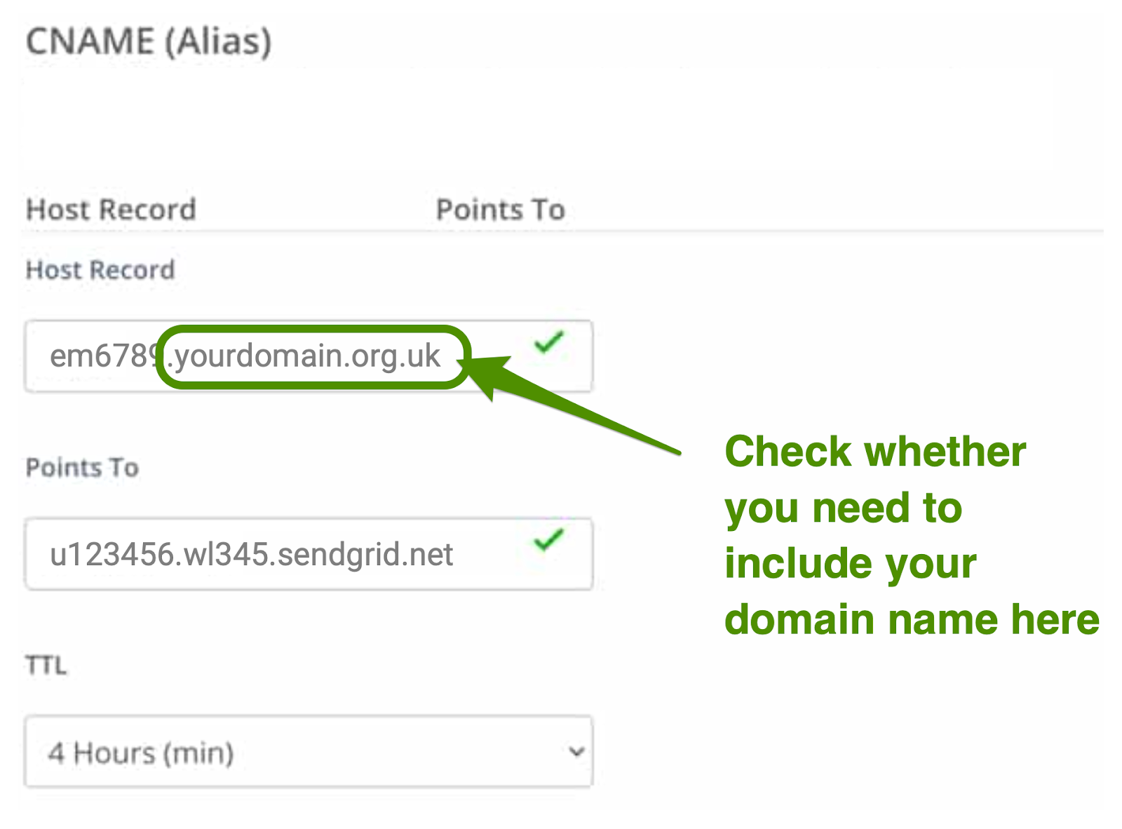 Check whether your provider will automatically add the domain to the Host field. If this is the case, you will need to just add the Host field excluding the domain (e.g. add ‘em6789’ instead of ‘em6789.yourdomain.org.uk’)