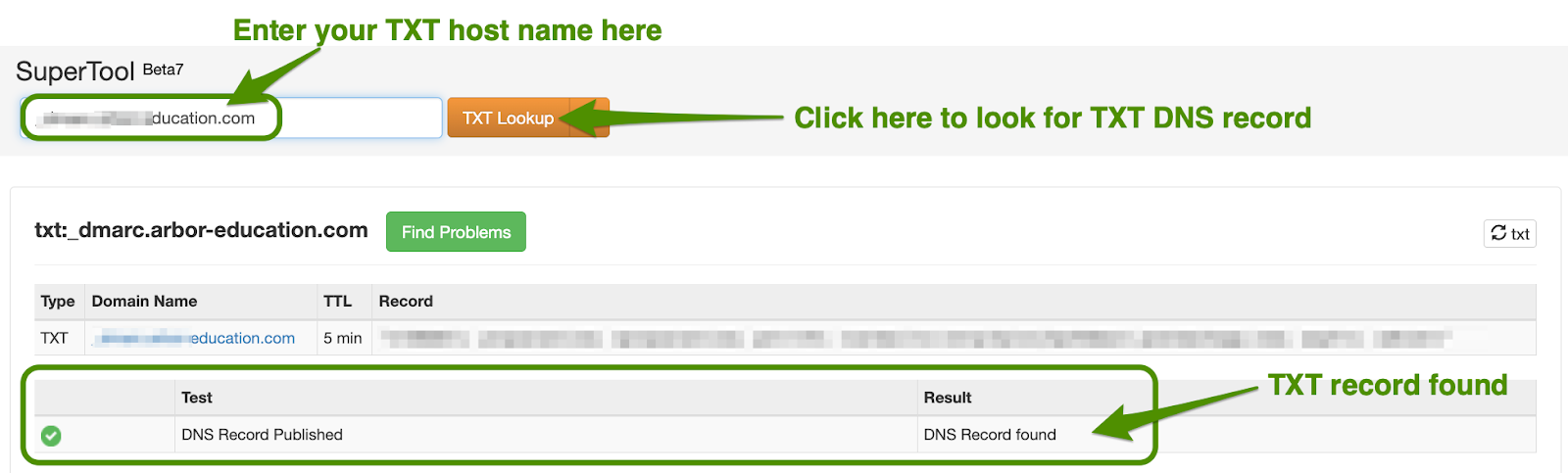 To check your TXT record, use the ‘TXT Lookup’. See below: