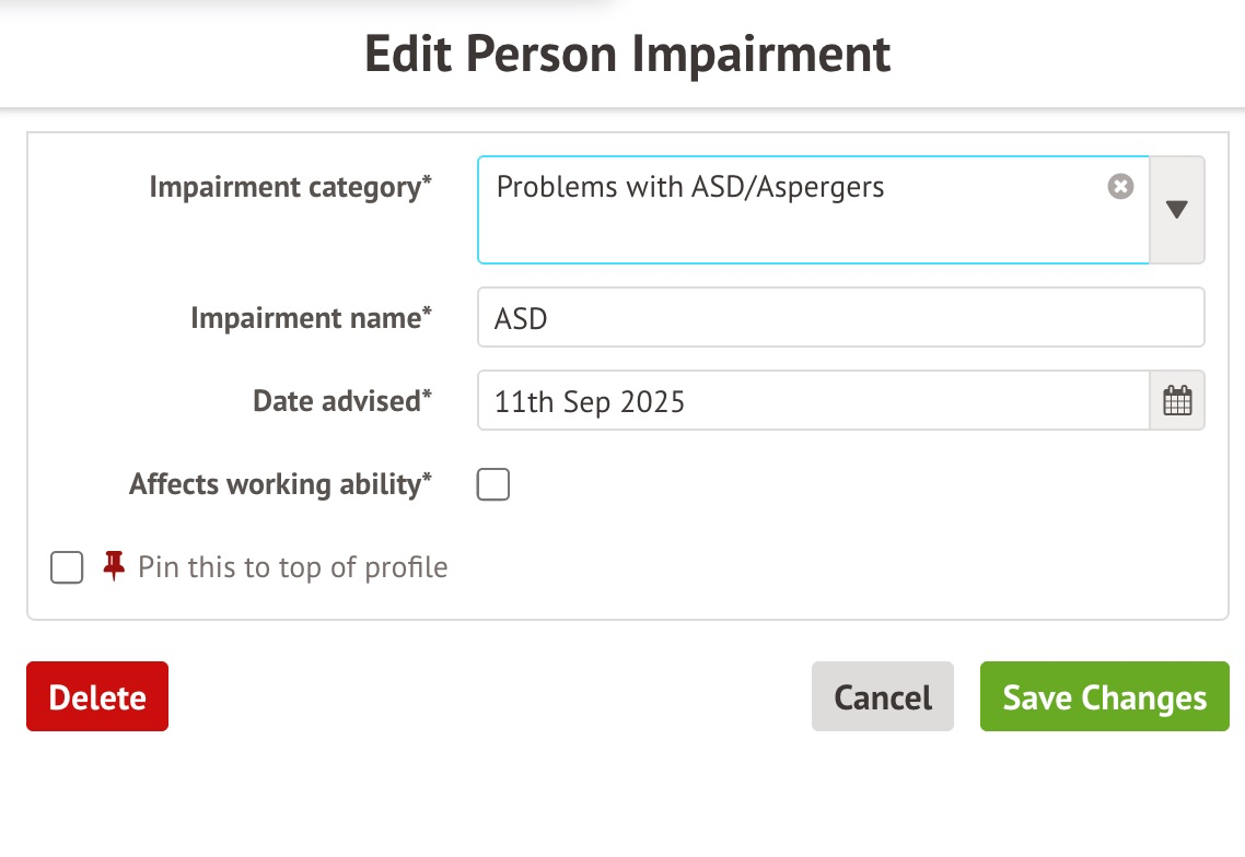 - Pin or unpin the Impairment to the top of the staff profile using the tick box
