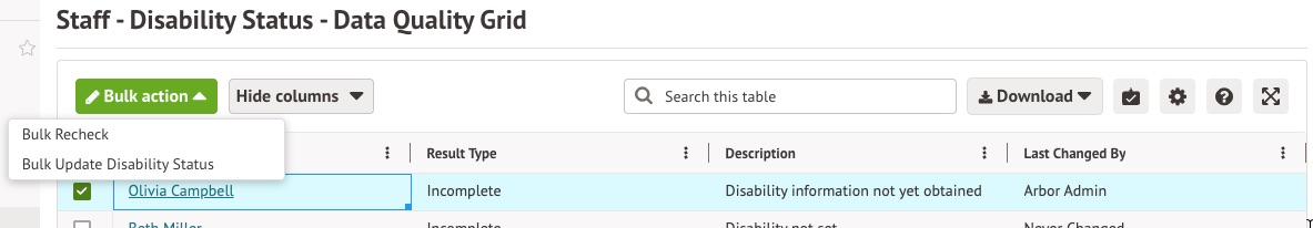 - Use the Disability Status dropdown to select a status to apply to all of the selected staff