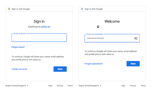 - If you are already logged in to your Google account in your Google Chrome browser, you will be automatically redirected to the next step. Remember - We advise using Google Chrome to use Arbor as this is the most secure and reliable browser.