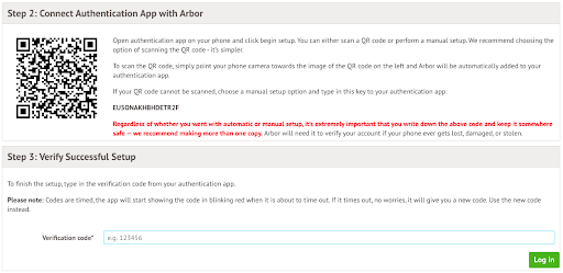Once the setup of your authenticator is complete, enter your Arbor password and the verification code into Arbor, and click Log in.
