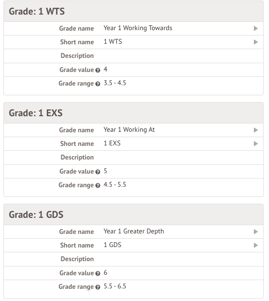- Your new marking grade set is comparable to the old scale, so the marks are converted correctly. In my example, I want students working at the expected standard for year 1 to be marked with a 1, so when setting up the new grade set, I need to set the grade 1 with a value of 5.