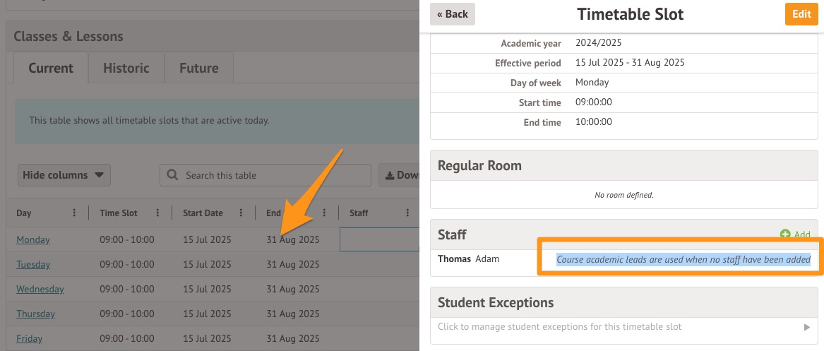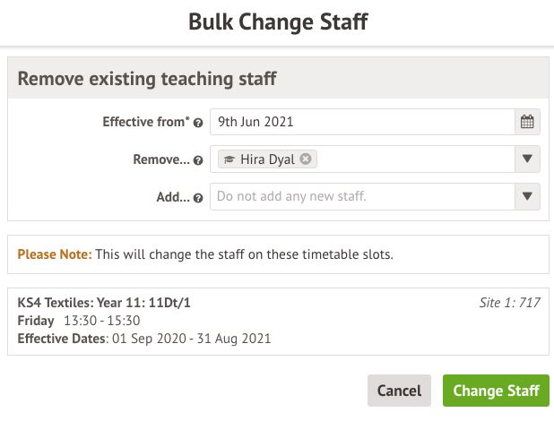 Please note: The removed staff member will still appear as the staff member on the timetable slots page. This is because they had at some point had the slot assigned to them, but it will no longer appear on their calendar from the effective date.