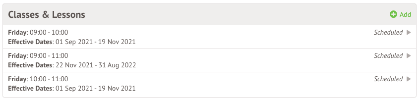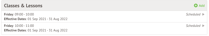 Click +Add in the Classes & Lessons section to schedule the new longer register session to start from tomorrow.