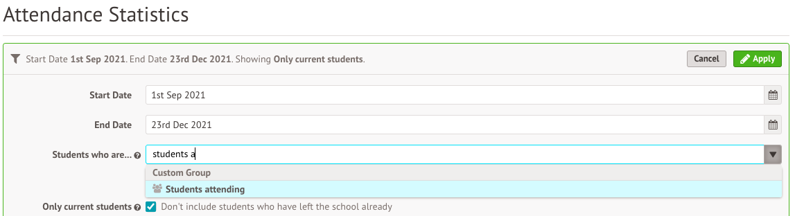 Once you have created the Custom Group you can then go ahead and use the custom group to report on student attendance only for the students who are attending. For example, from the Attendance Statistics page.